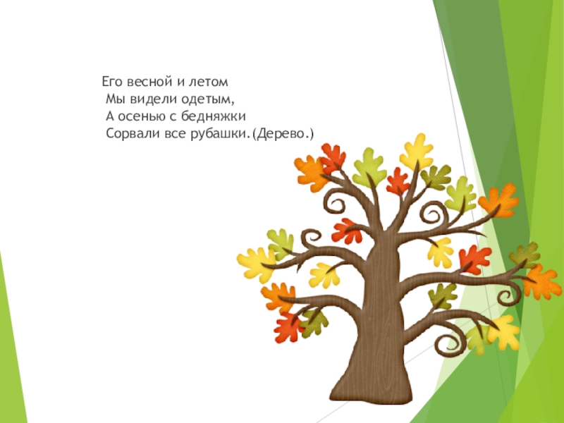 Слайд 2 Его весной и летом Мы видели одетым, А осенью с бедняжки Сорвали