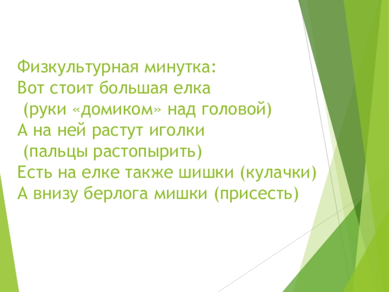 Слайд 10Физкультурная минутка: Вот стоит большая елка (руки «домиком» над головой) А на ней