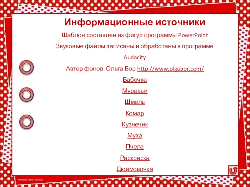 Информационные источникиШаблон составлен из фигур программы PowerPointЗвуковые файлы записаны и обработаны в программе AudacityАвтор фонов Ольга Бор