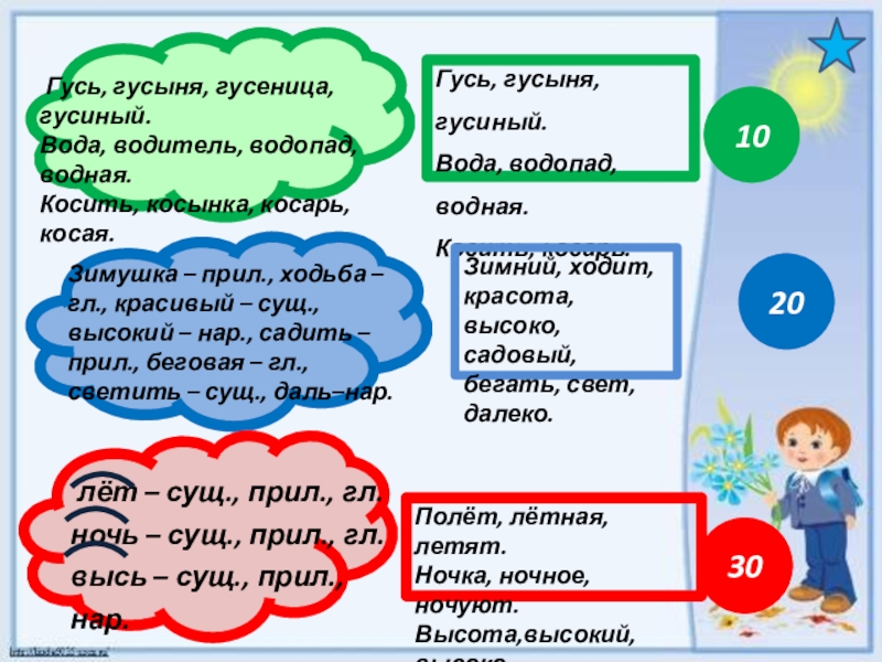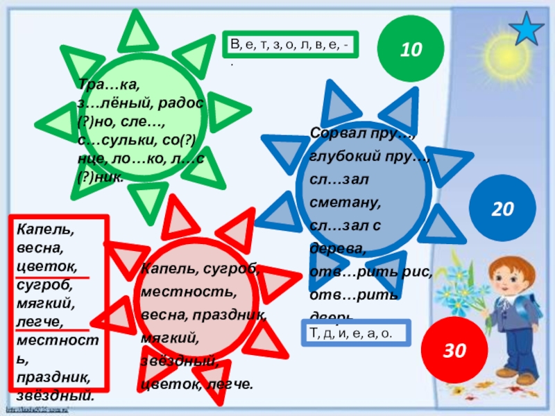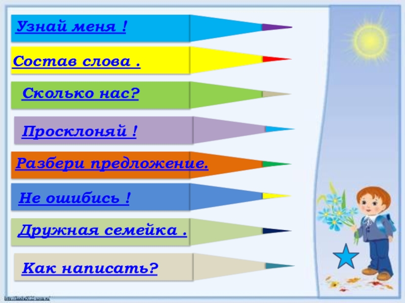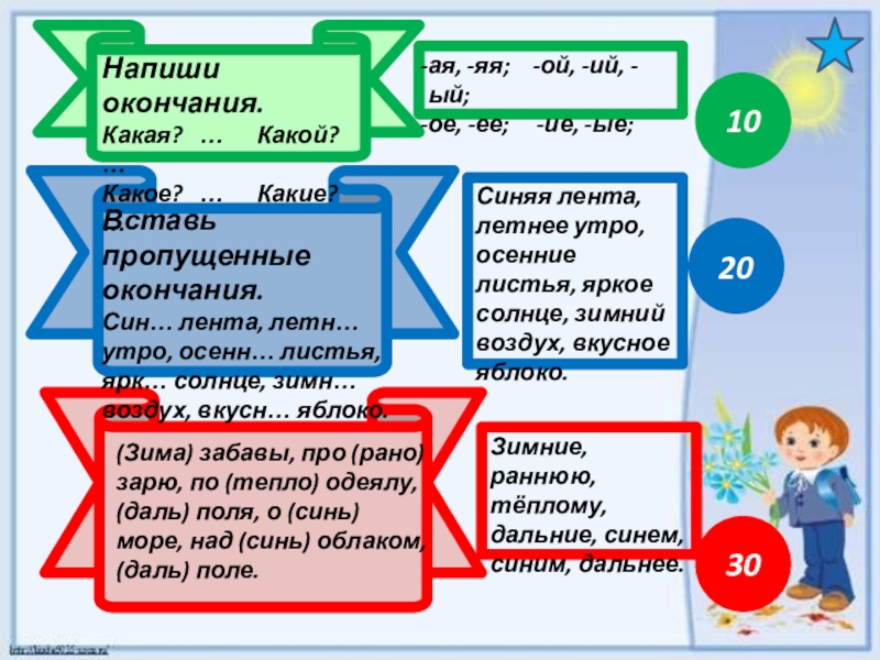 Син… лента, летн… утро, осенн… листья, ярк… солнце, зимн… воздух, вкусн… яблоко.