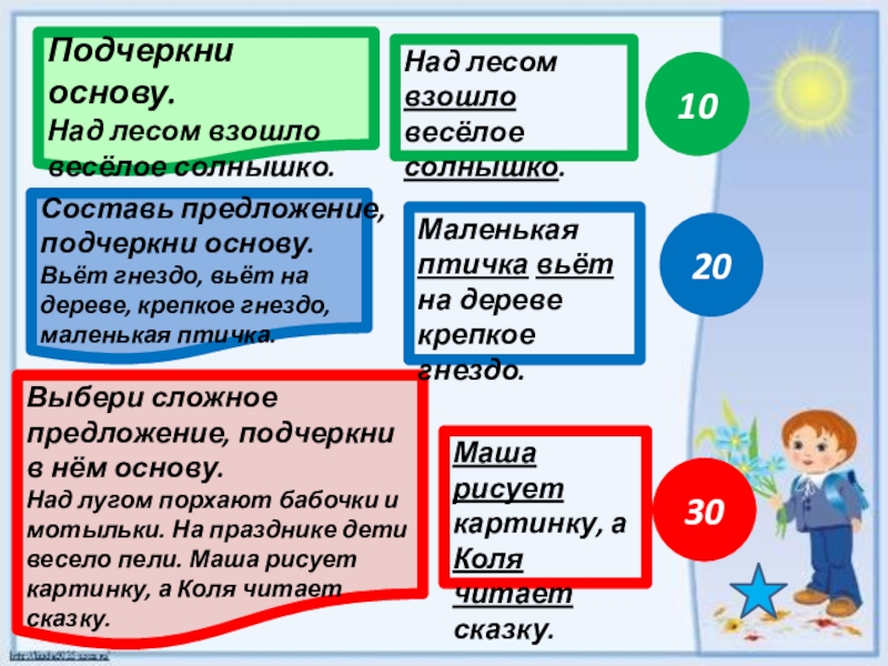 Над лугом порхают бабочки и мотыльки. На празднике дети весело пели. Маша рисует картинку, а Коля читает сказку.