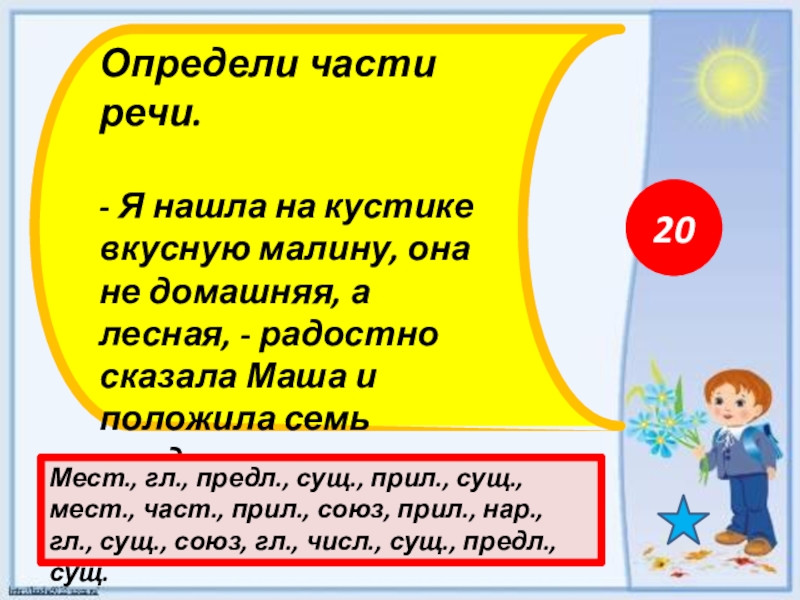 Мест., гл., предл., сущ., прил., сущ., мест., част., прил., союз, прил., нар., гл., сущ., союз, гл., числ., сущ., предл., сущ.