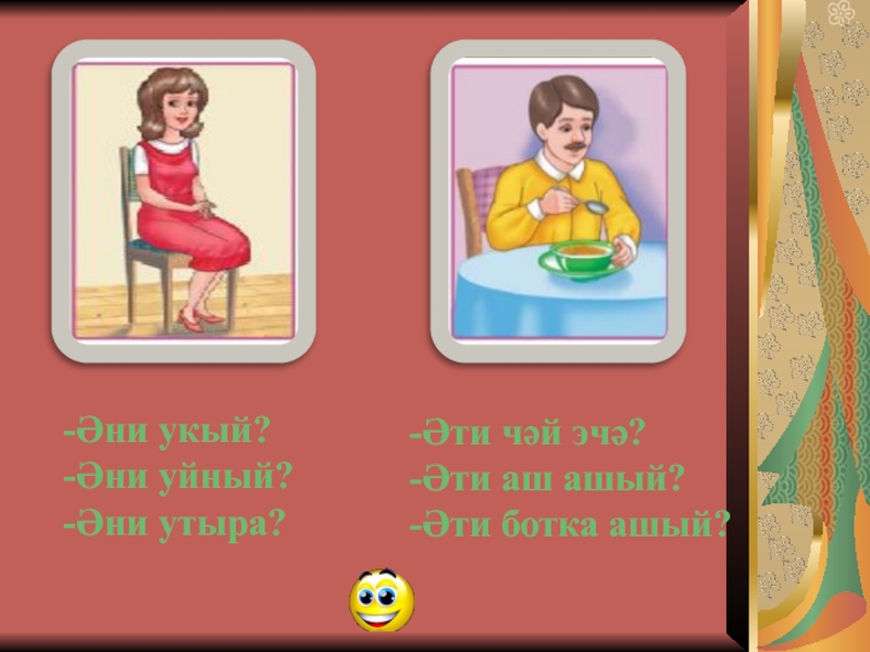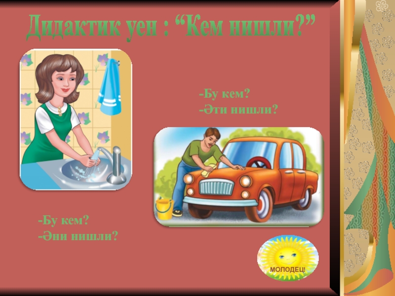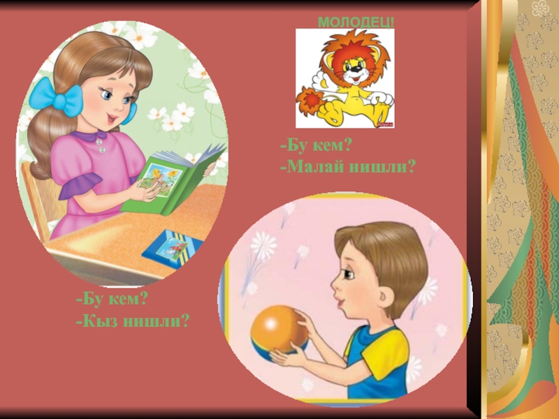 -Бу кем?-Кыз нишли?-Бу кем?-Малай нишли?МОЛОДЕЦ!