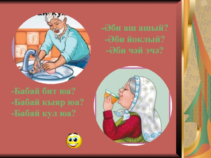 -Бабай бит юа?-Бабай кыяр юа?-Бабай кул юа? -Әби аш ашый?-Әби йоклый?-Әби чәй эчә?