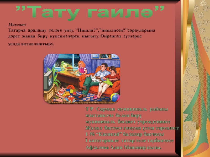 ”Тату гаилә”Максат:Татарча аралашу теләге уяту. ”Нишли?”,”нишлисең?”сорауларына       дөрес җавап бирү күнекмәләрен ныгыту.