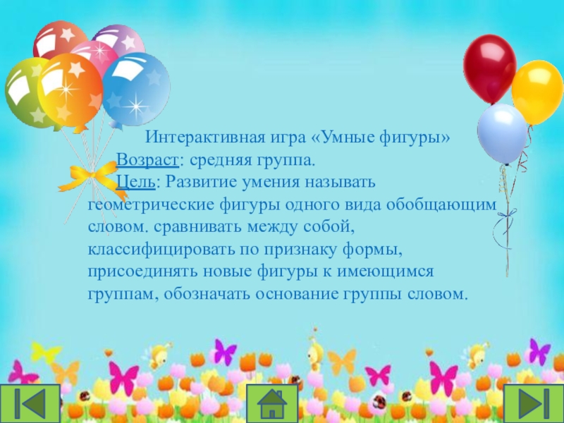 Интерактивная игра «Умные фигуры» Возраст: средняя группа. Цель: Развитие умения называть геометрические фигуры одного вида обобщающим словом. сравнивать между собой, классифицировать по признаку формы, присоединять новые фигуры к имеющимся группам, обозначать основание группы словом.