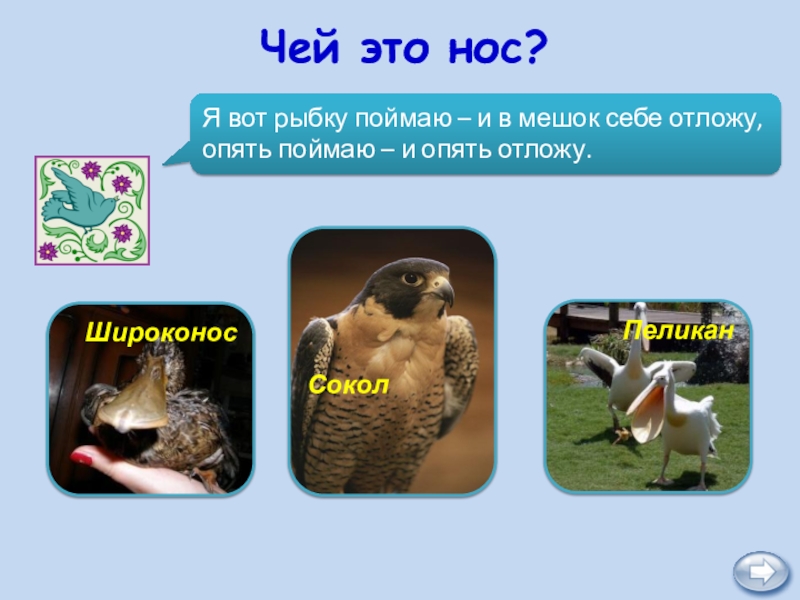 ЗАДАЧИ: продолжать формировать познавательный интерес к окружающему миру, различным представителям птиц, желание больше узнать об их жизни, повадках; учить детей классифицировать объекты по общему признаку; развивать логическое мышление, внимание, наблюдательность; воспитывать заботливое отношение к птицам, уважительное отношение к природе.