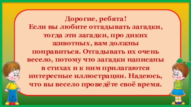животных, вам должны понравиться. Отгадывать их очень весело, потому что загадки написаны в стихах и к ним прилагаются интересные иллюстрации. Надеюсь, что вы весело проведёте своё время.