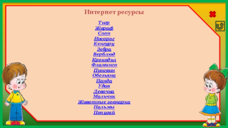 Интернет ресурсыТигрЖирафСлонНосорогКенгуруЗебраВерблюдКрокодилФламингоПингвинОбезьянаПандаУдавДевочкаМальчикЖивотные зоопаркаПальмыПопугай