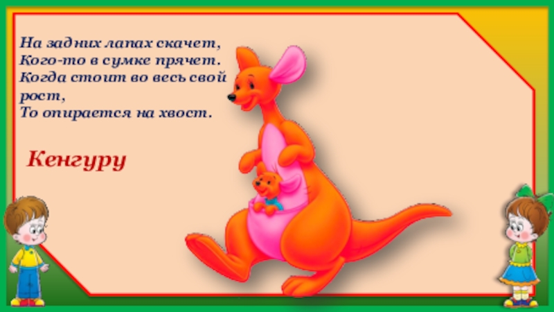 КенгуруНа задних лапах скачет,Кого-то в сумке прячет.Когда стоит во весь свой рост,То опирается на хвост.
