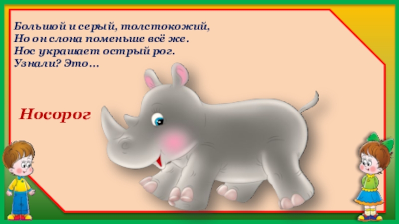 НосорогБольшой и серый, толстокожий, Но он слона поменьше всё же.Нос украшает острый рог.Узнали? Это…
