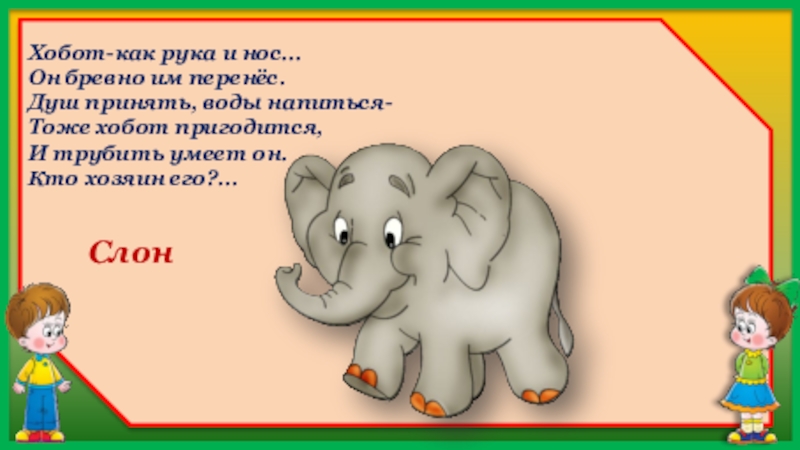 СлонХобот-как рука и нос…Он бревно им перенёс.Душ принять, воды напиться-Тоже хобот пригодится, И трубить умеет он.Кто хозяин