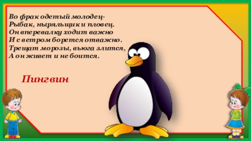 ПингвинВо фрак одетый молодец-Рыбак, ныряльщик и пловец.Он вперевалку ходит важноИ с ветром борется отважно.Трещат морозы, вьюга злится,А