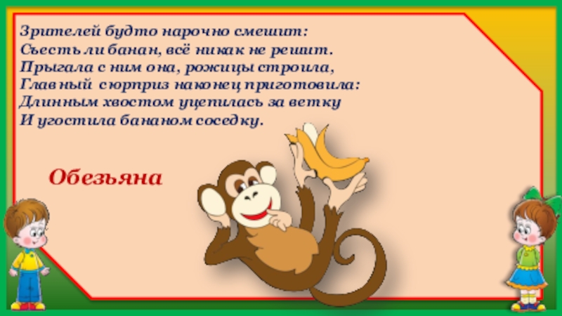 ОбезьянаЗрителей будто нарочно смешит:Съесть ли банан, всё никак не решит.Прыгала с ним она, рожицы строила,Главный сюрприз наконец