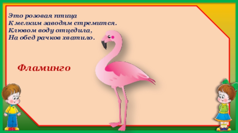ФламингоЭто розовая птицаК мелким заводям стремится.Клювом воду отцедила,На обед рачков хватило.