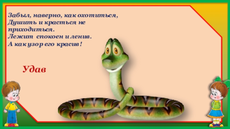 УдавЗабыл, наверно, как охотиться,Душить и красться не приходиться.Лежит спокоен и ленив.А как узор его красив!