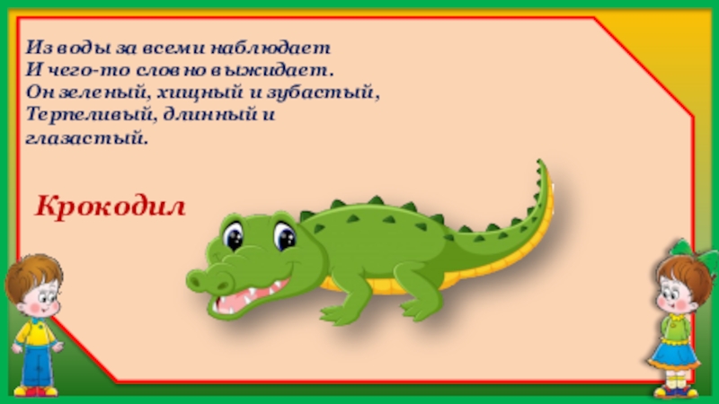 КрокодилИз воды за всеми наблюдаетИ чего-то словно выжидает.Он зеленый, хищный и зубастый,Терпеливый, длинный иглазастый.