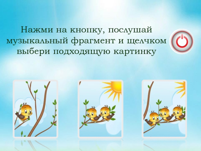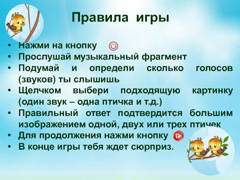 Правила игрыНажми на кнопкуПрослушай музыкальный фрагментПодумай и определи сколько голосов (звуков) ты слышишьЩелчком выбери подходящую картинку (один звук – одна птичка и т.д.)Правильный ответ подтвердится большим изображением одной, двух или трех птичекДля продолжения нажми кнопкуВ конце