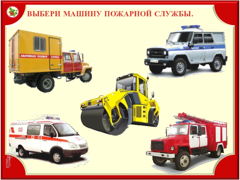Слайд 3ВЫБЕРИ МАШИНУ ПОЖАРНОЙ СЛУЖБЫ.