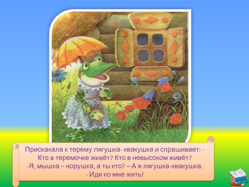 Прискакала к терему лягушка- квакушка и спрашивает: - Кто в теремочке живёт? Кто в невысоком живёт? -Я,