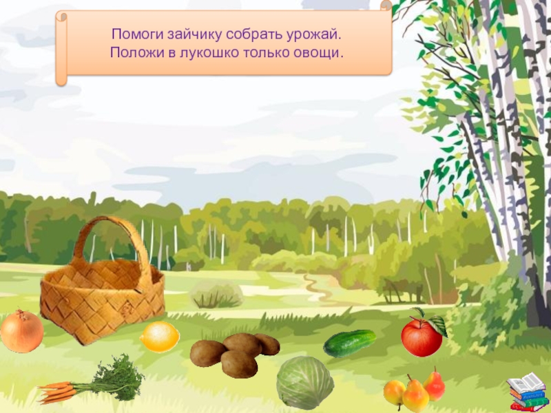 Слайд 10Помоги зайчику собрать урожай. Положи в лукошко только овощи.