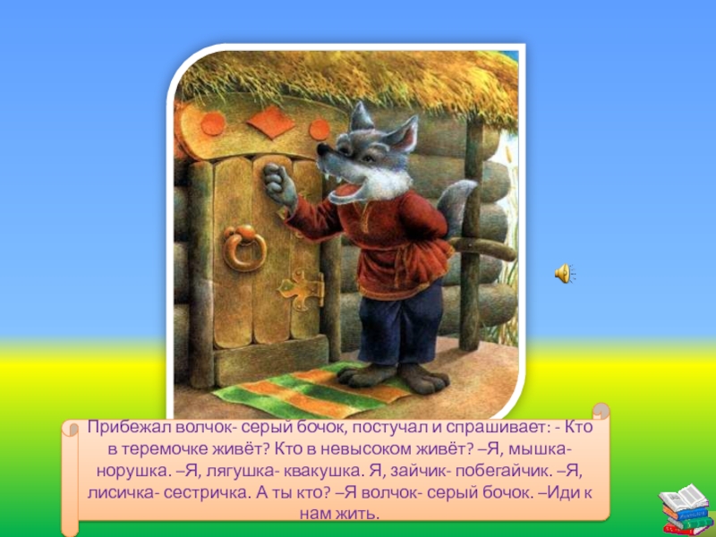Слайд 14Прибежал волчок- серый бочок, постучал и спрашивает: - Кто в теремочке