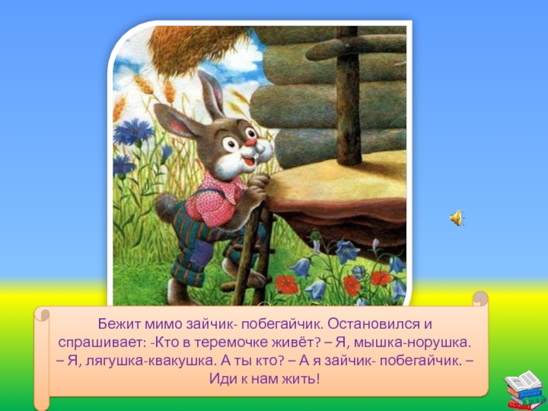 Бежит мимо зайчик- побегайчик. Остановился и спрашивает: -Кто в теремочке живёт? – Я, мышка-норушка. – Я, лягушка-квакушка.