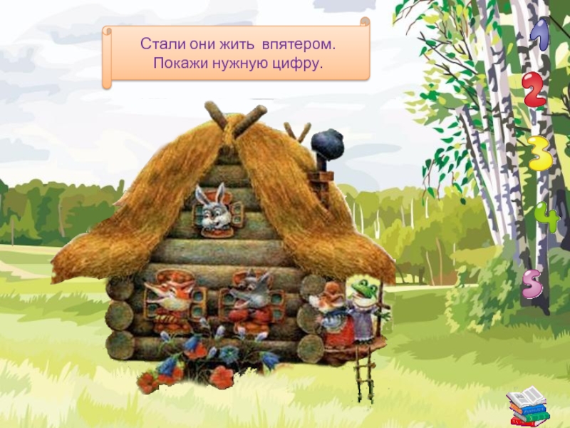 Слайд 15Стали они жить впятером. Покажи нужную цифру.