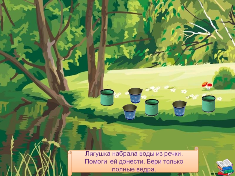 Слайд 7Лягушка набрала воды из речки. Помоги ей донести. Бери только полные