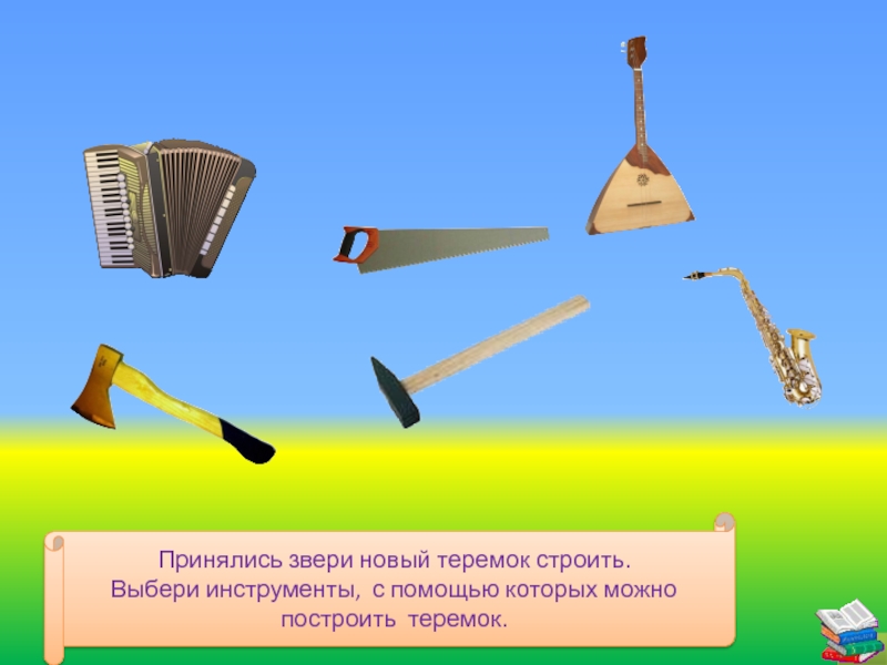 Слайд 19Принялись звери новый теремок строить. Выбери инструменты, с помощью которых можно