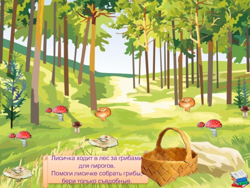 Лисичка ходит в лес за грибами для пирогов.  Помоги лисичке собрать грибы, бери только съедобные.