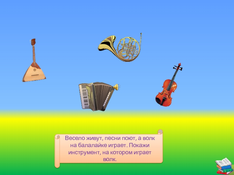 Слайд 16Весело живут, песни поют, а волк на балалайке играет. Покажи инструмент,