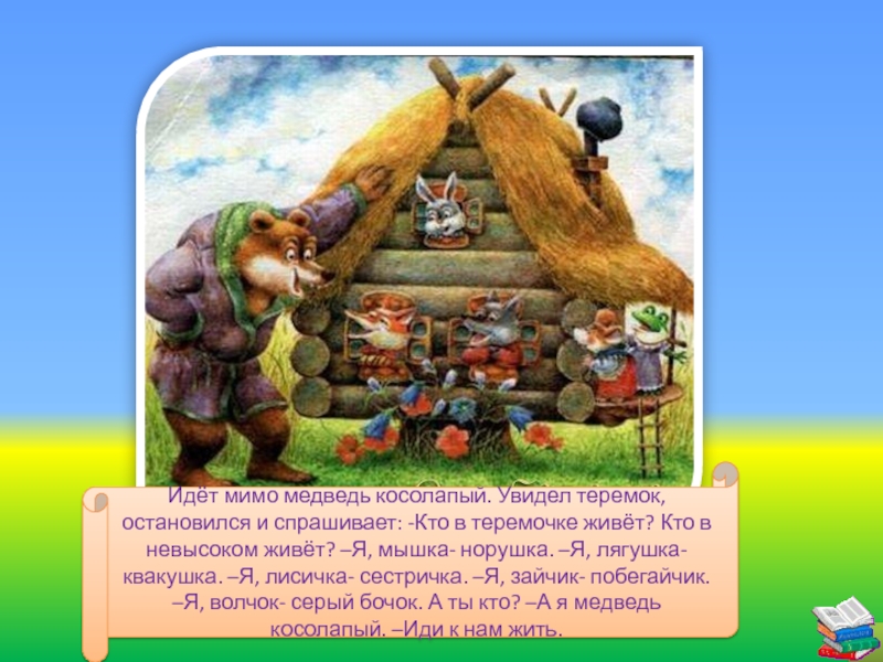 Слайд 17Идёт мимо медведь косолапый. Увидел теремок, остановился и спрашивает: -Кто в