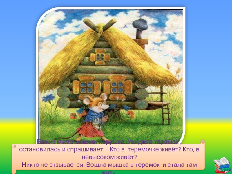 Кто в теремочке живёт? Кто, в невысоком живёт? Никто не отзывается. Вошла мышка в теремок и стала там жить.