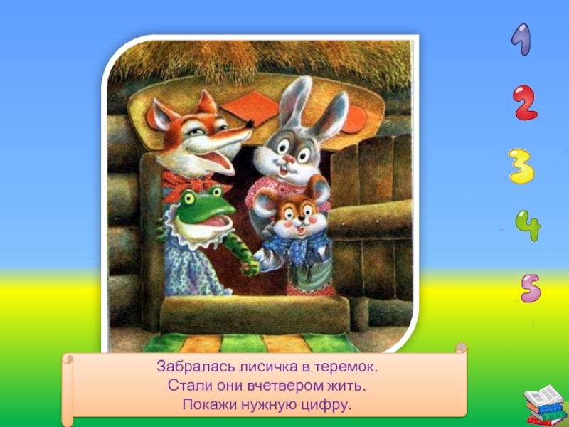 Слайд 12Забралась лисичка в теремок. Стали они вчетвером жить. Покажи нужную цифру.