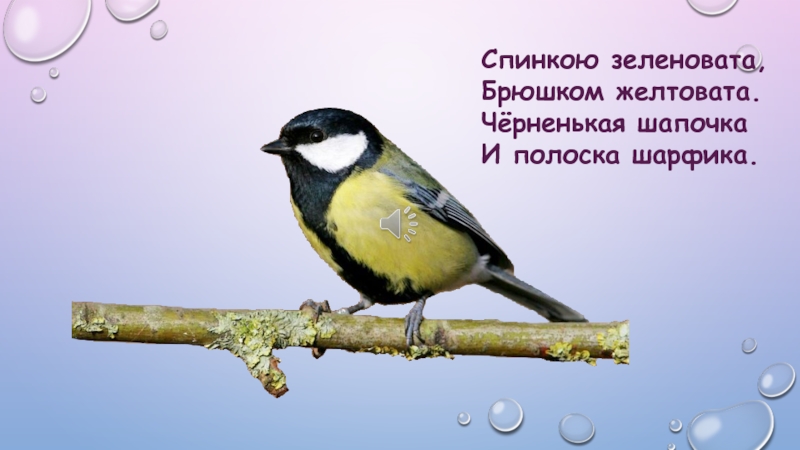 Спинкою зеленовата,Брюшком желтовата. Чёрненькая шапочкаИ полоска шарфика.