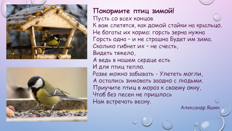Покормите птиц зимой!Пусть со всех концов К вам слетятся, как домой стайки на крыльцо. Не богаты их корма: