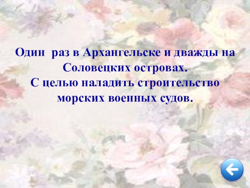 Слайд 40Сколько раз и с какой целью Пётр І посещал Архангельскую губернию?