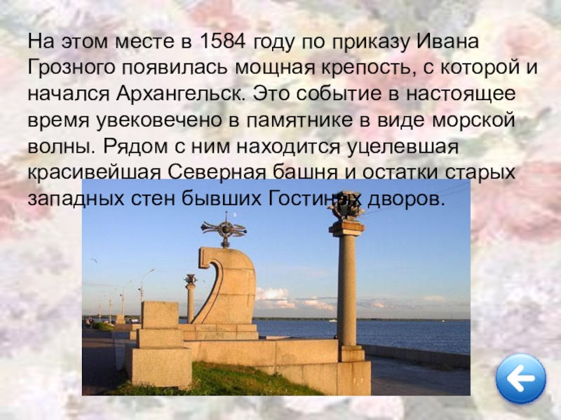 мощная крепость, с которой и начался Архангельск. Это событие в настоящее время увековечено в памятнике в виде морской волны. Рядом с ним находится уцелевшая красивейшая Северная башня и остатки старых западных стен бывших Гостиных дворов.