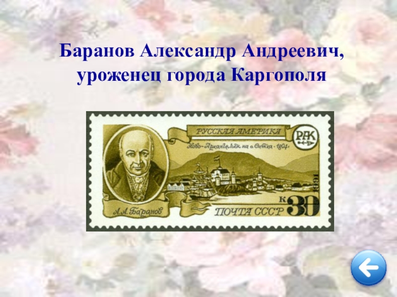 Слайд 54Баранов Александр Андреевич, уроженец города Каргополя