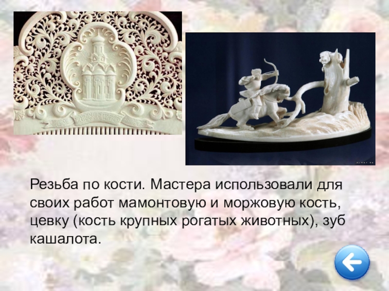Слайд 59Резьба по кости. Мастера использовали для своих работ мамонтовую и моржовую