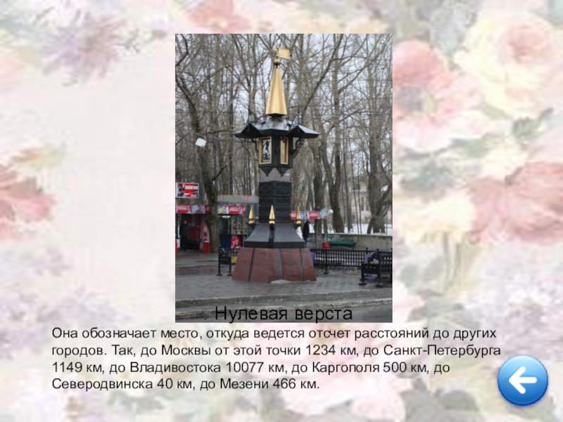 Так, до Москвы от этой точки 1234 км, до Санкт-Петербурга 1149 км, до Владивостока 10077 км, до Каргополя 500 км, до Северодвинска 40 км, до Мезени 466 км.
