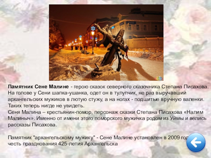 Слайд 21Памятник Сене Малине - герою сказок северного сказочника Степана Писахова. На голове