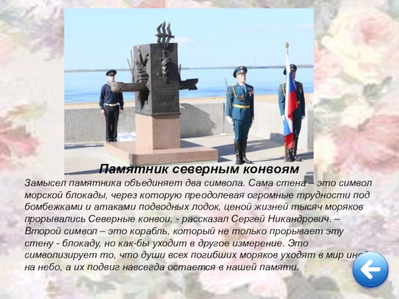 символ морской блокады, через которую преодолевая огромные трудности под бомбежками и атаками подводных лодок, ценой жизней тысяч моряков прорывались Северные конвои, - рассказал Сергей Никандрович. – Второй символ – это корабль, который не только прорывает эту стену - блокаду, но как-бы уходит в другое измерение. Это символизирует то, что души всех погибших моряков уходят в мир иной, на небо, а их подвиг навсегда остается в нашей памяти.