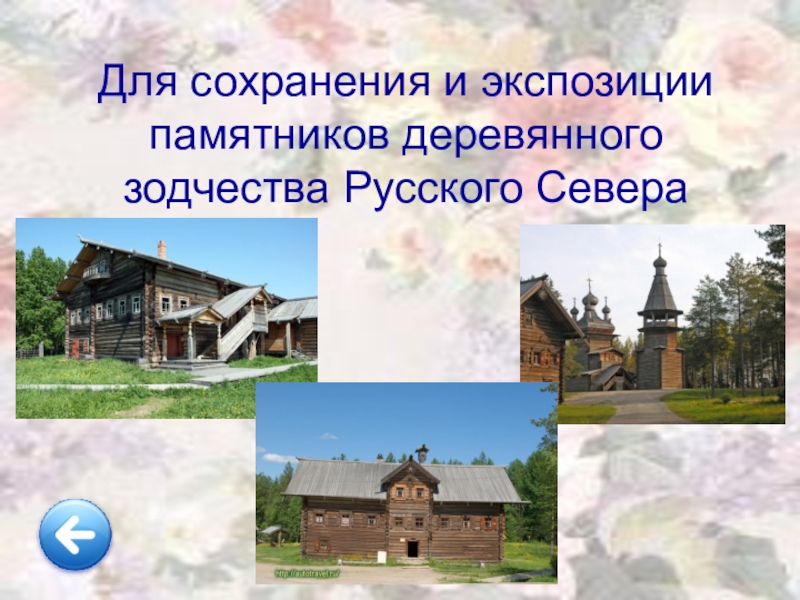 Слайд 69Для сохранения и экспозиции памятников деревянного зодчества Русского Севера