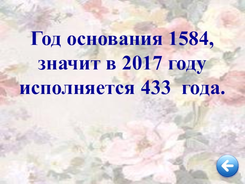 Слайд 43Год основания 1584, значит в 2017 году исполняется 433 года.