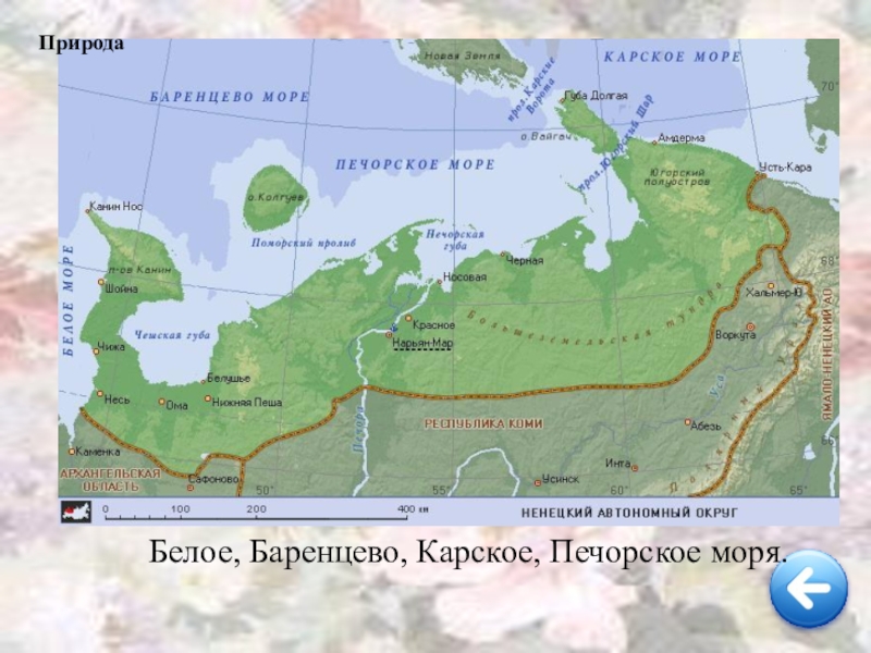 Слайд 34Белое, Баренцево, Карское, Печорское моря.