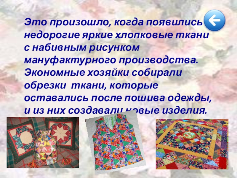 мануфактурного производства. Экономные хозяйки собирали обрезки ткани, которые оставались после пошива одежды, и из них создавали новые изделия.