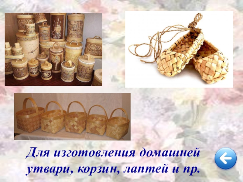 Слайд 61Для изготовления домашней утвари, корзин, лаптей и пр.