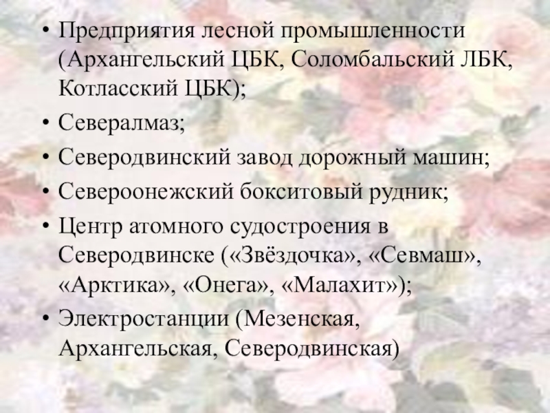 Слайд 72Предприятия лесной промышленности (Архангельский ЦБК, Соломбальский ЛБК, Котласский ЦБК);